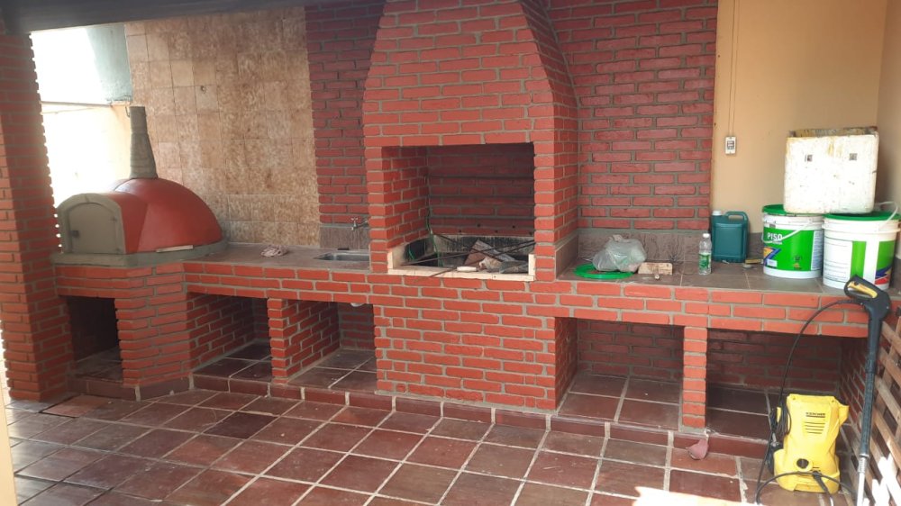 Área gourmet com churrasqueira e forno de pizza.